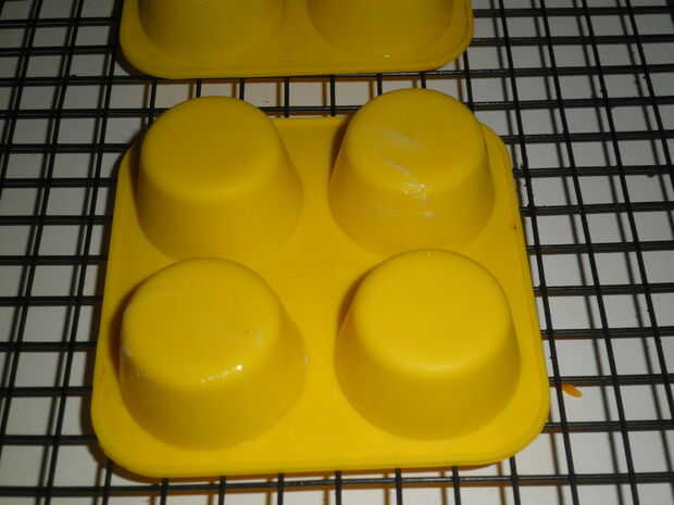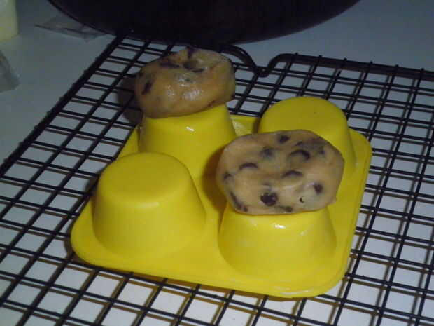 Tomar la bandeja de muffins de silicona y Voltéela boca abajo. Poner mantequilla en la parte superior y laterales de la bandeja de muffins. Coloque la bandeja en la bandeja de enfriamiento. Vuelva a colocar las bolitas de galleta en la parte superior de la bandeja de muffins. Asegúrese de que las bolas se encuentran en el medio exacto o la cookie se expandirá irregularmente.