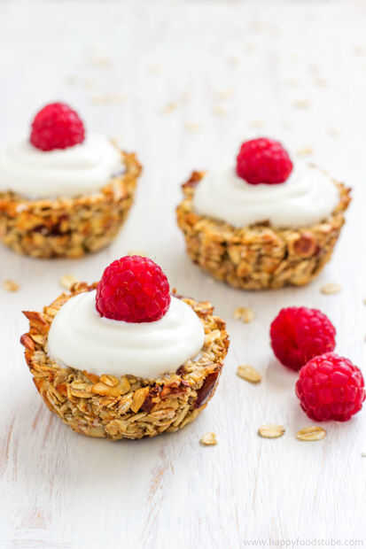6. servir con una cucharada de yogur griego y frambuesas en la parte superior (opcional).