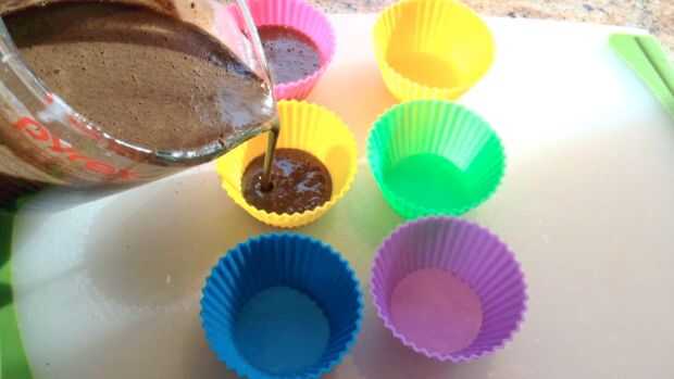 Configurar tus moldes de Magdalena, si usas forros de papel cupcake recomendaría capas algunos para asegurarse de que los moldes son robusta y gruesa por lo que el jabón no ir a través. Ahora, vierta en la mezcla de jabón. Vierta aproximadamente un centímetro arriba, o la misma altura de una taza de mantequilla de maní. Si hay burbujas y te molesta, puede tratar de sacarlos antes de verter, spray el jabón vertido con alcohol isopropílico o cortado al final.