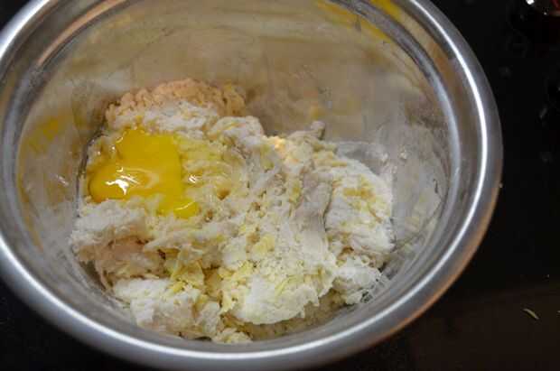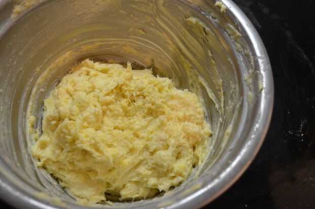 Sigue amasando, añada los huevos, uno a la vez. Añadir entonces la mantequilla 2 cucharadas a la vez, mezclando hasta que se incorpora cada adición. La masa final se verá como una mezcla entre pastel masa y masa de pan.