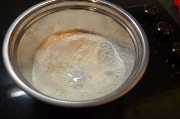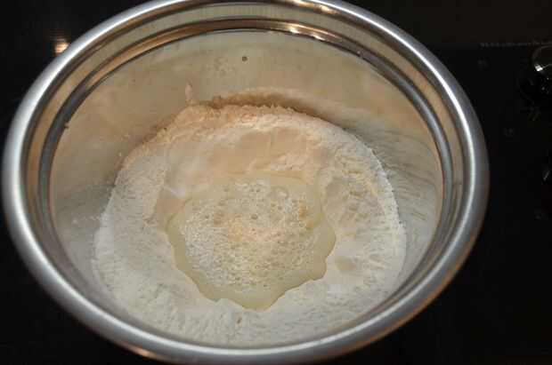 Coloque la harina en un recipiente grande o en el recipiente de tu batidora eléctrica equipada con un gancho para masa. Hacer un pozo en la harina y vierta la mezcla de levadura. Comience a amasar.