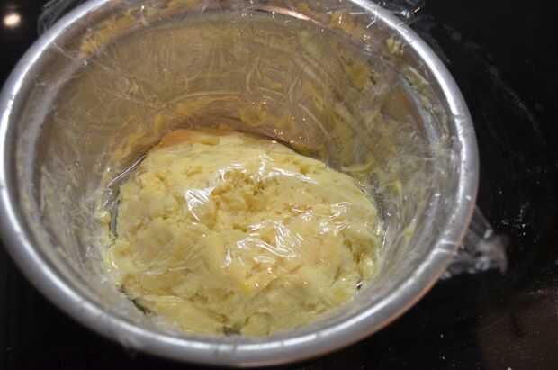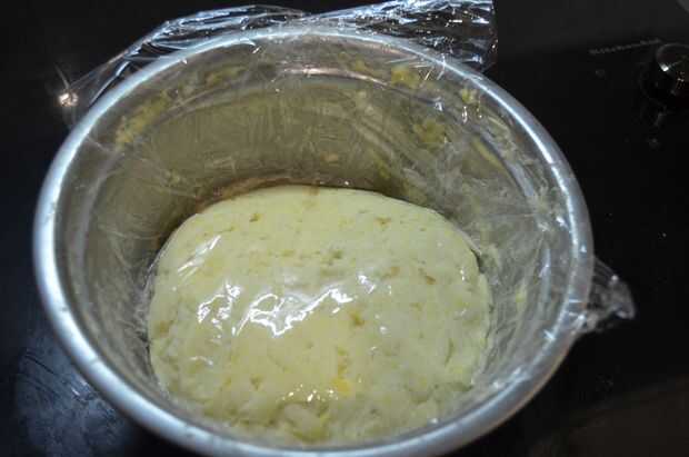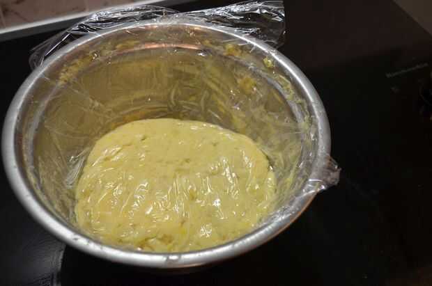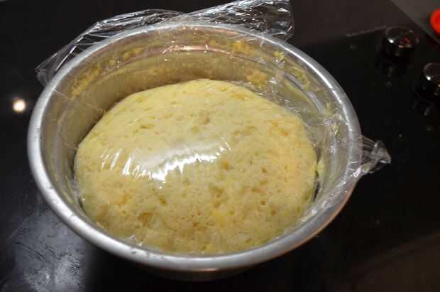 Cubra el tazón con papel plástico y deje que la masa suba hasta que se duplica en tamaño (alrededor de 1 1/2 horas).