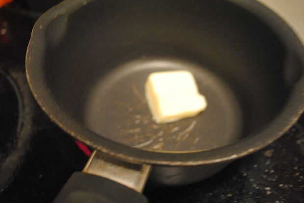 -En su olla de salsa, gire el calor hasta medio/alto a derretir una cucharada de mantequilla. Incline la olla, deslizando la fusión mantequilla a lo largo de todas las superficies en el bote. Esto hace un poco menos pegajoso en allí.