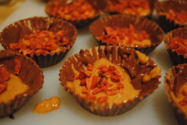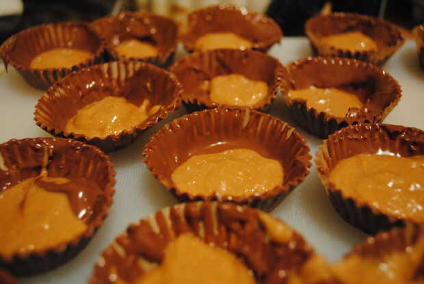 -Una vez que se han endurecido por conchas, cuchara tamaño de cuchara de mesa bolas de mantequilla de maní en los centros de las tazas.