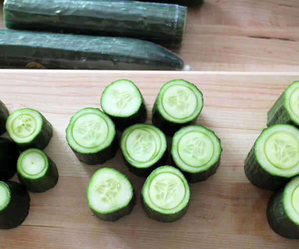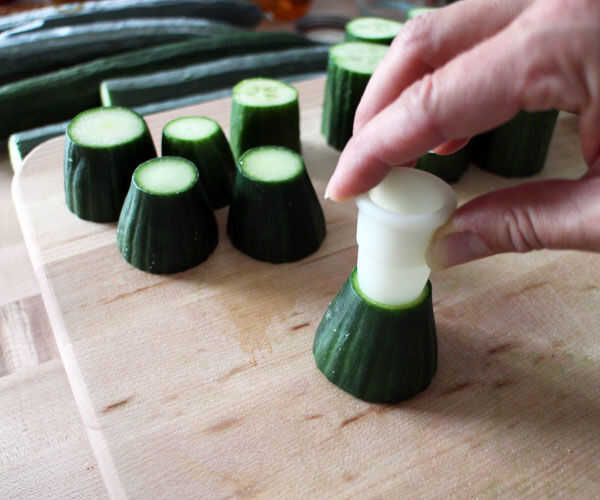 Usar cortadores de la galleta de círculo pequeño para poner impresiones círculo centrado en lo que va a ser la parte superior de las secciones. A utilizar estos como guías cuando usted corte las cavidades de la taza. Trata de escoger un tamaño de corte que deja al menos 1/8" a 3/16" pepino 'carne' alrededor del borde para una sustancial suficiente espesor de pared.