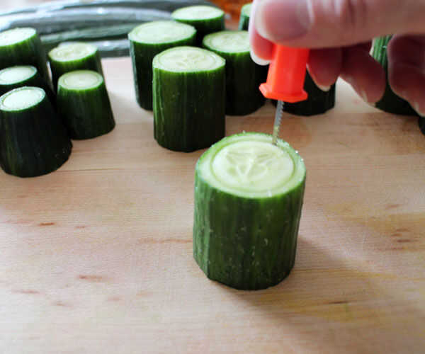 Usar su cuchillo calabaza pequeña o cuchillo de cocina para cortar en los segmentos de pepino siguiendo las guías del círculo,
