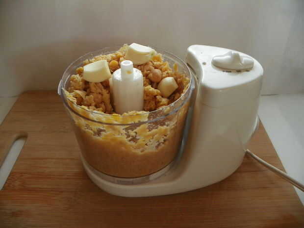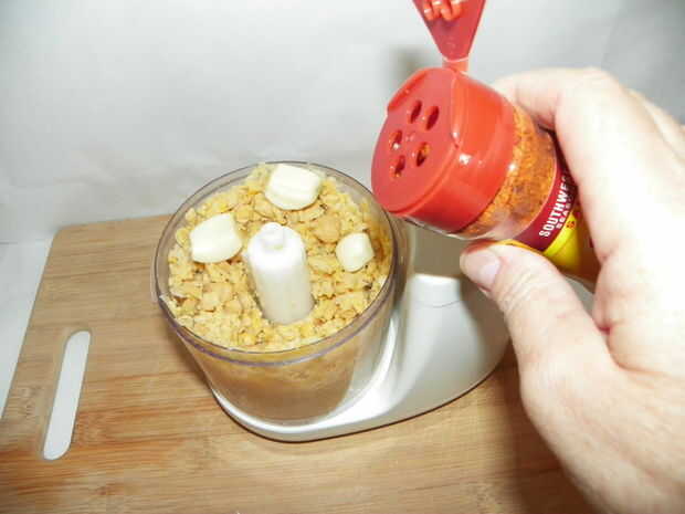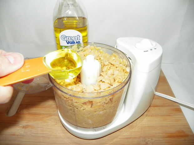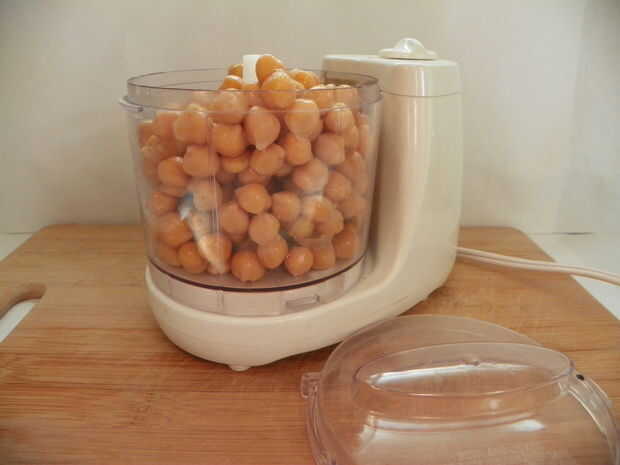 Abrir la lata de garbanzos. Desagüe. Colocar frijoles en el procesador de alimentos y mezcle. Pelar dientes de ajo, utilicé 3 pero solo puede 1 o 2. Añadir ajo a los frijoles. Añadir 4 cucharadas de aceite de oliva y 1 cucharadita sazonador de Sra. Dash. Hacer puré la mezcla en el procesador de alimentos.