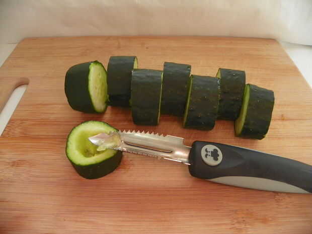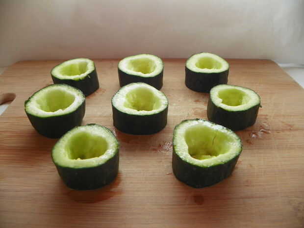 esta receta es para ir junto con mis tazas de pepino comestible para cócteles post.Usted tendrá que hacer primero las tazas comestibles para preparar este cóctel con la sacada con pala hacia fuera la pulpa de pepino. Para la Copa del cómo hacerlo, ha