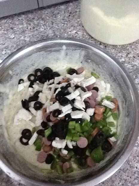 Ahora tienes cuatro pasos sencillos para que pueda hacerse. 1. Agregue los huevos, la sal y la vainilla extracción en el tazón y mezclan juntos bien. 2. Añadir los ingredientes líquidos, leche y aceite y batir otra vez bien. 3. Añadir la harina, orégano, pimienta negra y polvo de hornear y mezclar hasta combinar, tratan de no sobre mezclar, y usted lo quiere como un espesor de la mezcla de brownie. Finalmente agregar las coberturas desea y realmente encontré que convertiría fuera realmente buena si pones algunos secos tomate en él, o unas semillas. Y al agregar que los toppings pliegue a la masa con una espátula o una cuchara normal.