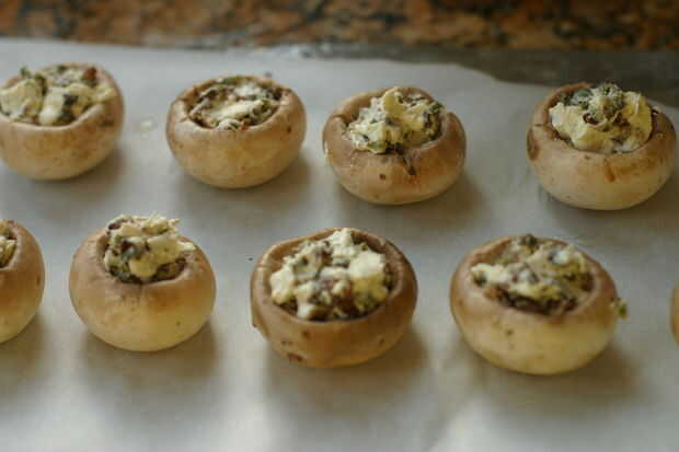 Mezclar el queso crema y crema con el tocino y jalapeños. Cepillo de cada una de las setas con aceite vegetal y colóquelas en una bandeja encima de papel de pergamino. Vierta la mezcla en cada uno.