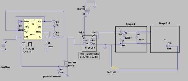 Hice esto con 5 etapas y vino una cantidad de voltaje de 10-12kV.