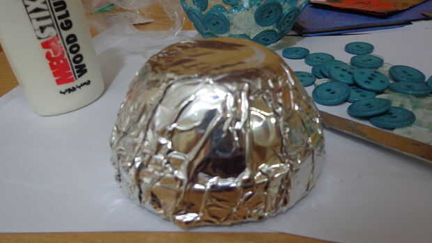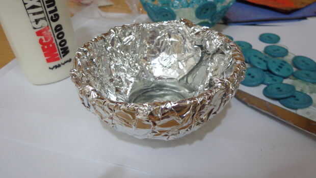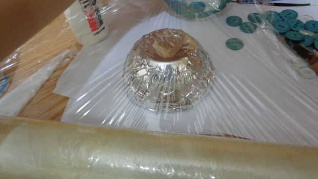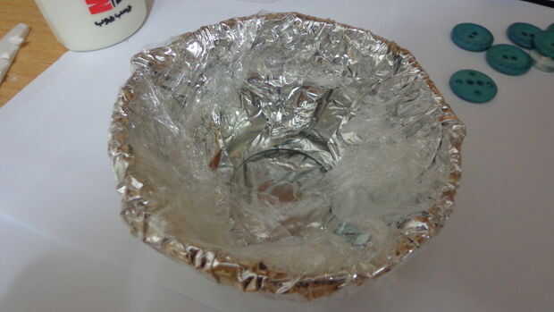 cubra el tazón con papel de aluminio muy apretado. el empuje las piezas debajo de la taza y con las manos para que la lámina tenga la forma exacta del recipiente. luego cubrir la hoja y tazón de fuente con una capa de cubierta de plástico muy ajustada y hacer lo mismo debajo de la taza.