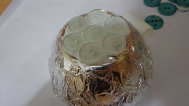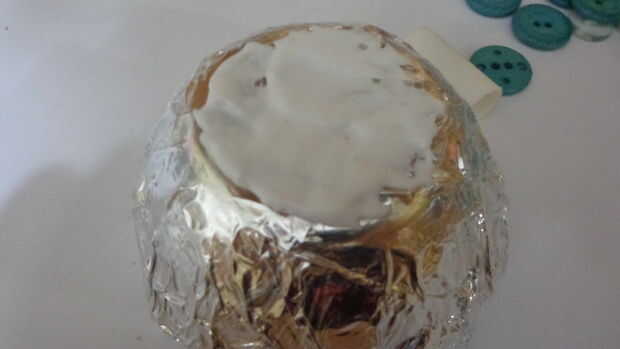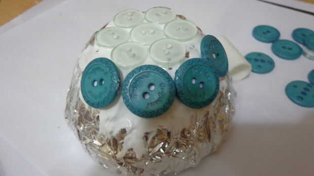 usar cuchillo para frotar el pegamento en el tazón de fuente. pegar cada botón una por una cuidadosamente en el recipiente. Asegúrese de que el pegamento no es demasiado en la superficie. hacerlo hasta que se llene el tazón de fuente.