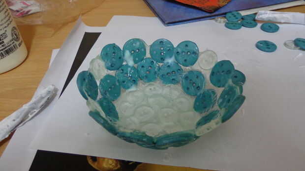 esperar 24h, para mejor resultado pero el tiempo depende del tipo de su cola y cuán grande es el recipiente. luego cortar el papel y cubierta de plástico debajo de la taza poco a poco y separarlo de los botones. usted no puede hacer esto con los botones multicolores también!