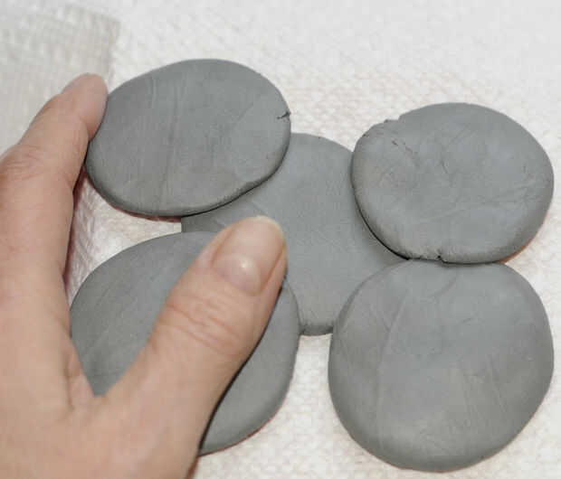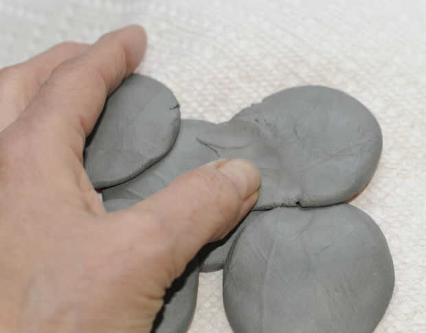 Colocar cada disco de arcilla uno por un lado con textura por encima de la taza de plástico papel toalla cubierto.