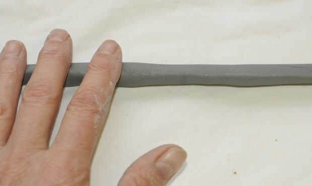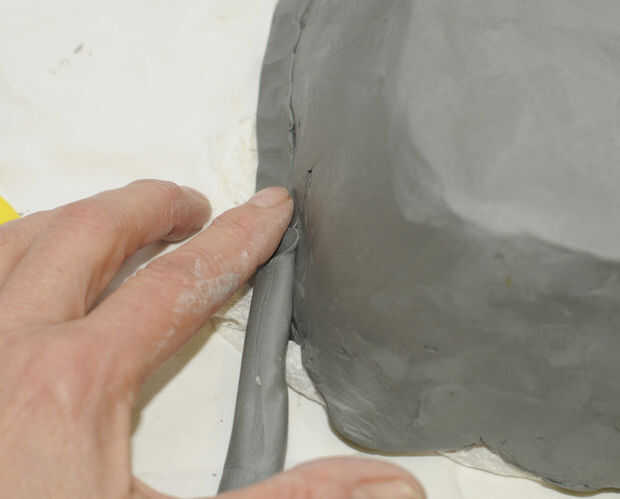 Manteniendo la taza al revés, rollo de una bobina de arcilla y presiona alrededor de la boca del recipiente. Si la arcilla se ha convertido en seco, puede que necesite rociar ligeramente con agua y tomar una brocheta de madera y marcar cada pedazo (hacer marcas de rayado) y humedecer ligeramente para que las piezas se adhieren entre sí.