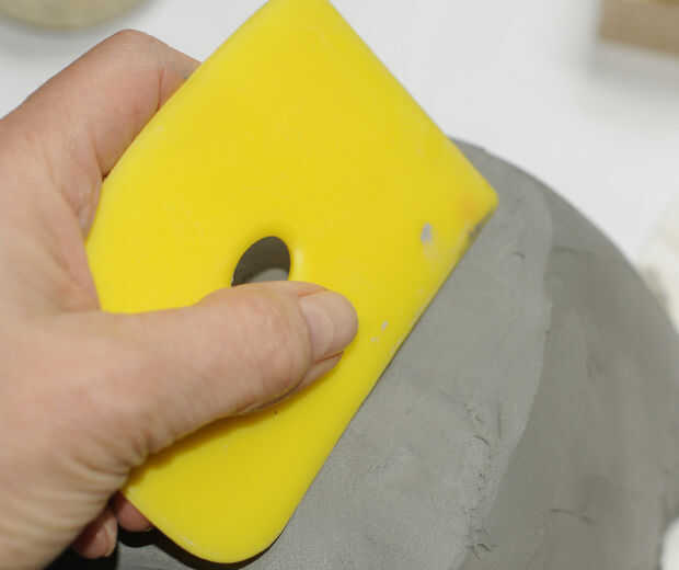 Cuando han cubierto completamente el recipiente con discos de arcilla, tomar una costilla de goma o una tarjeta de crédito plástica y alisar suavemente la superficie de mezcla horizontal.