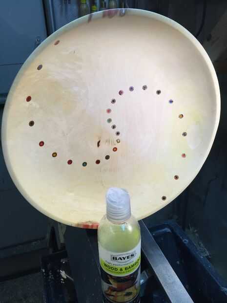 La única manera realmente pude decir que estuve cortando a través de lápices de colores era las virutas de color ocasionales que se acumulan en mi gubia del tazón de fuente. Los lápices no proporcionan cualquier problema durante el torneado o el lijado final. Yo uso aceite de bloque de carnicero, también conocido como aceite mineral, para cubrir inicialmente la mayoría de mis cuencos. De la foto de arriba que usted puede ver que la parte inferior del tazón de fuente ha estado cubierta mientras que la otra mitad todavía tiene una superficie intacta.