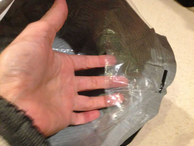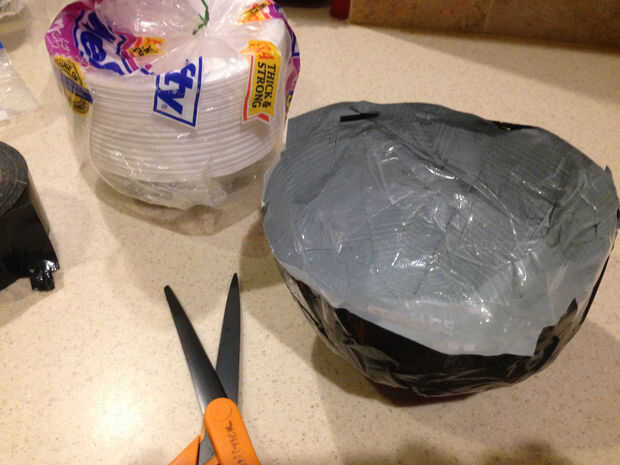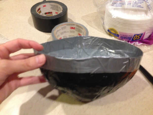 - Tomar la casi-un-perro-bowl su tazón de fuente forma. Presione los lados entre las manos o contra la mesa para asegurarse de que la cinta es segura. Si usted siente cualquier área delgada, reforzarlos con más cinta adhesiva. El interior del recipiente tendrá aletas sueltas de las esquinas de la bolsa de plástico. Probablemente alguien puede imaginar mejor forma de lidiar con estos rincones, pero no afectan la usabilidad del tazón de fuente, así que les dejo.