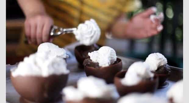 (1) primero es tazón de fuente de chocolate con leche con remolinos de chocolate blanco en el interior con salpicaduras en los bordes. Helado de chocolate con crema batida encima. (2 º y 3 º) Segundo y el tercero es con remolinos de chocolate con l