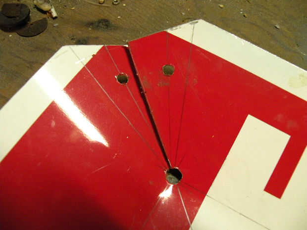 La última foto en este paso muestra la geometría de la ficha de esquina el más claro; dimensiones no son tan importantes como la disposición geométrica general de dos triángulos escalenos que son imágenes de espejo uno del otro, con un agujero perforado en el centro bruto de cada uno.