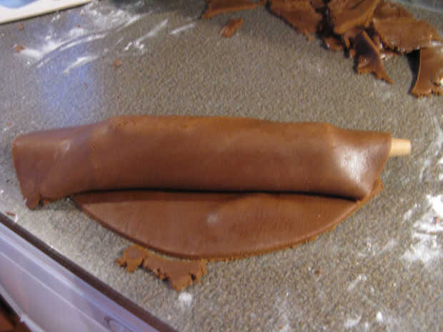 Para transferir, ruede para arriba la masa (como se muestra) en su enharinado y luego Desenrolle sobre el tazón.