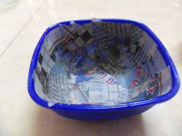 3 pegar los pedazos de periódico en la superficie interna mojada del recipiente.