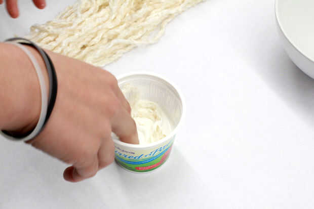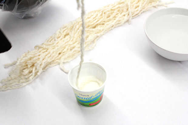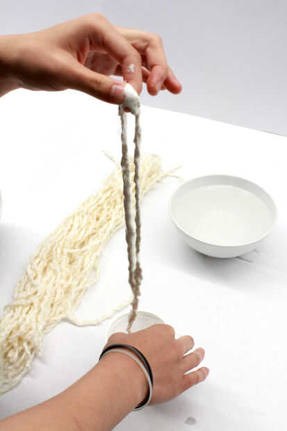 Cadenas de hilo individual de la inmersión en el pegamento, pellizcando el exceso