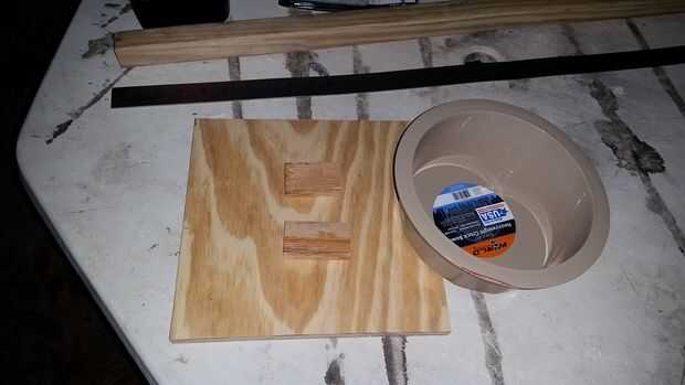 decidimos hacer un soporte de recipiente perro para nuestro perro, punto.  Puedes ver el antes de imagen.  Ella siempre Deslice su tazón de comida en mi rueda de bicicleta, y que tendría que inclinarse realmente conseguir el kibble.  Ahora ella tiene