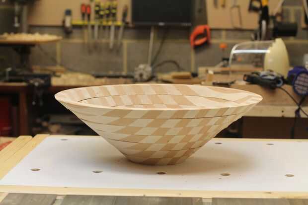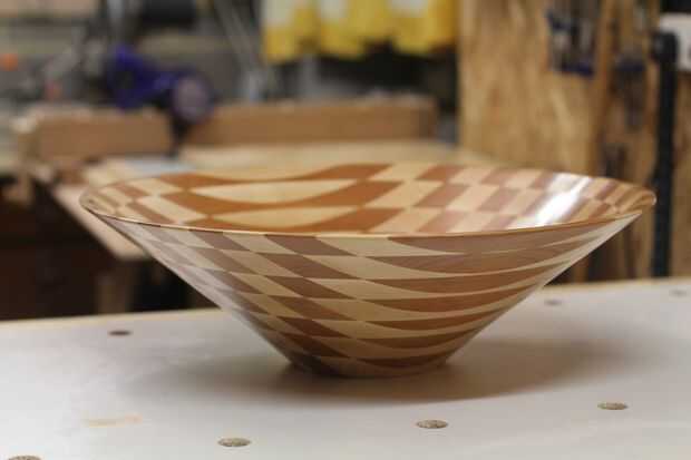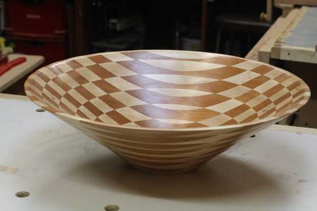Inspirado en unos cuencos que había visto, hecho por Michael Mode, hace un tiempo decidí saltar derecho en el final profundo y hacer este plato de 500mm (19,5"), usando una técnica sorprendentemente simple, laminación de anillos apilados. Utilicé mi torno para suavizar las capas, pero se podrían poder arena en su lugar. El proyecto no era sin es hipo (ver video), pero estaba muy contento con el resultado final.