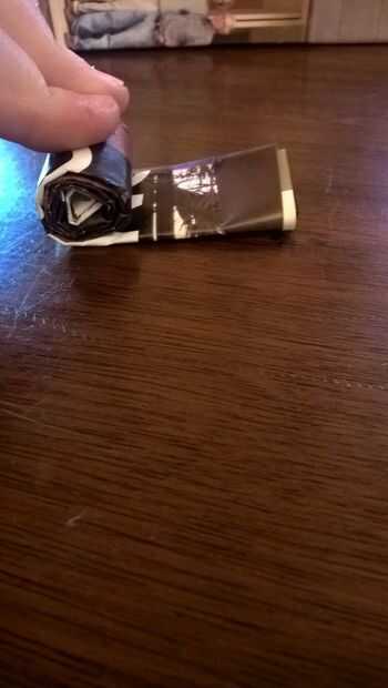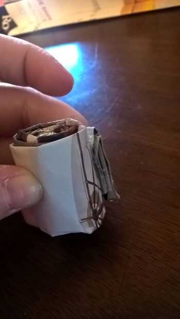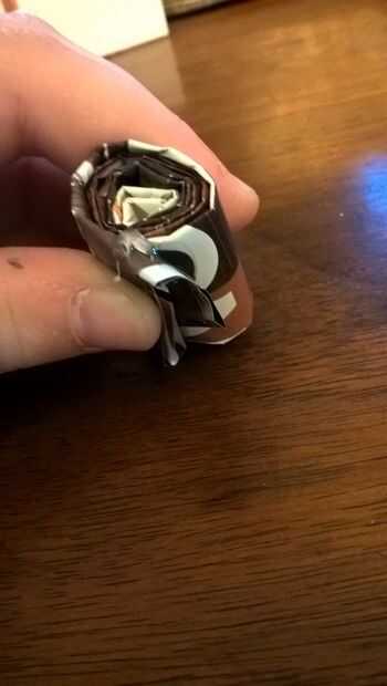 Tomar uno de los paneles y rodar hasta que sus aproximadamente del mismo tamaño como una pieza de sushi, utilice un poco de pegamento para mantenerlo así. Ahora otro panel y pegar en donde te quedaste, rollo como lo hiciste la primera vez y ahora pégalo en el lugar. Repita hasta que usted ha utilizado todos sus paneles.