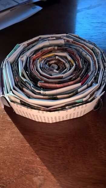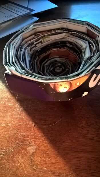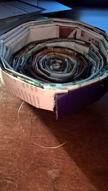 Ahora su enorme rollo de "sushi" y subir un poco los bordes. A continuación, tomar algunos de los aros interiores y llevarlos hacia arriba debajo de los primeros. Repita este paso hasta haber llegado a los últimos 5 anillos mediados, asegúrese de que estén a nivel para que puedan resistir su tazón de fuente.