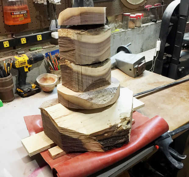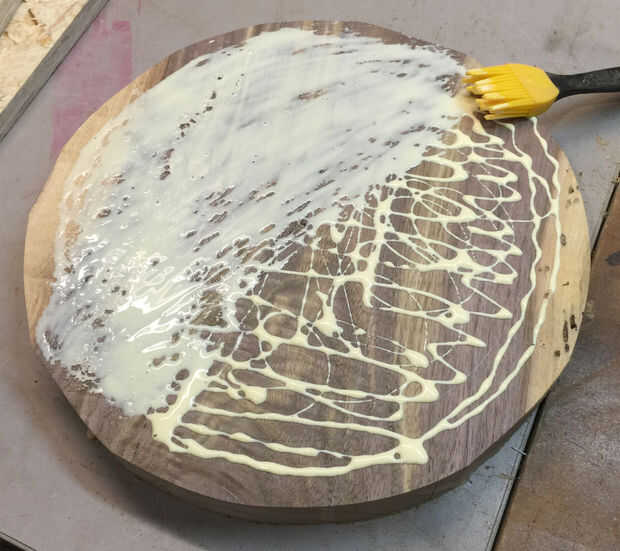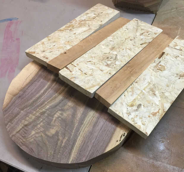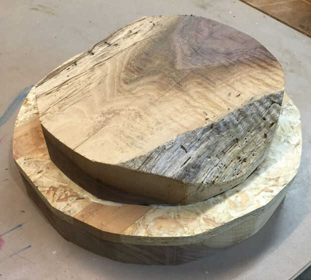 He decidido mantener el diseño de la sección central tan simple como sea posible así que fui con 5 tiras recta que se ajuste en el círculo más grande. Me aseguré de uniformemente repartidos un montón de pegamento como seguro para más tarde, realmente no quería que el tazón de fuente a desintegrarse en el torno! Que utilizar dos pinzas para mantener todas las tablas juntas mientras se seca y apilar un montón de peso en la parte superior para sostener todo hacia abajo hasta que el pegamento se seque. Lección aprendida, hicieron un trabajo terrible pegado a las tablas en su lugar y terminó con un montón de lagunas. Tuve que arreglar estas deficiencias más tarde. Antes de pegar la losa más pequeña de nuez en que tuve que volver a cepillar la superficie de las juntas para proporcionar una superficie plana para pegar.