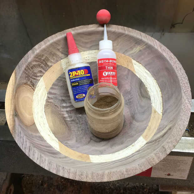 Tengo varios contenedores de distinto colores de polvo de madera para emparejar el polvo en el color del tazón de fuente. El polvo siempre obtendrá más oscuro una vez que el pegamento se agrega.