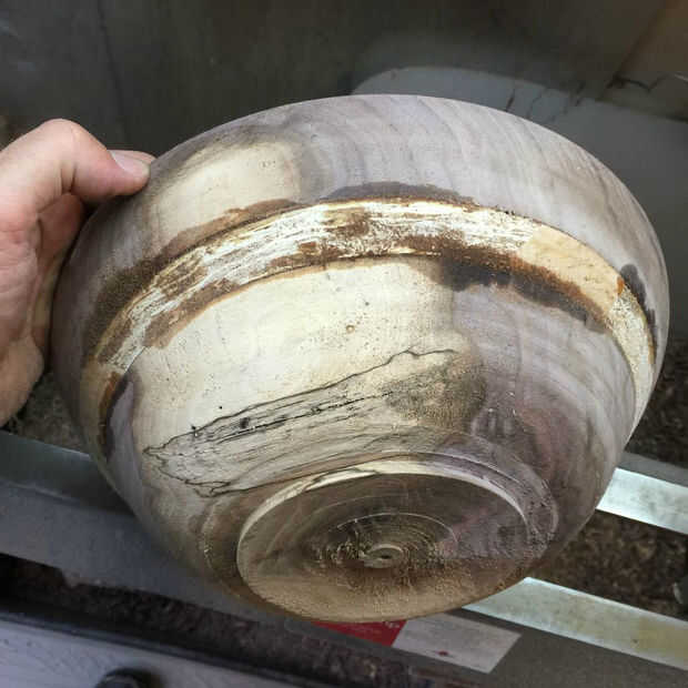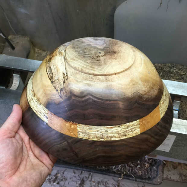 Después de que el pegamento se haya endurecido el tazón de fuente se remonta en el torno y un corte muy ligero se utiliza para traer todo a nivel de ser. Las diferencias desaparecen realmente en las regiones más oscuras de la madera.