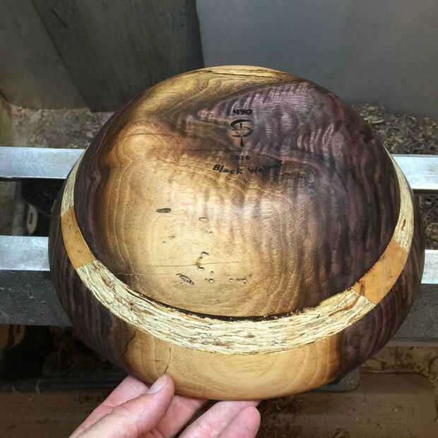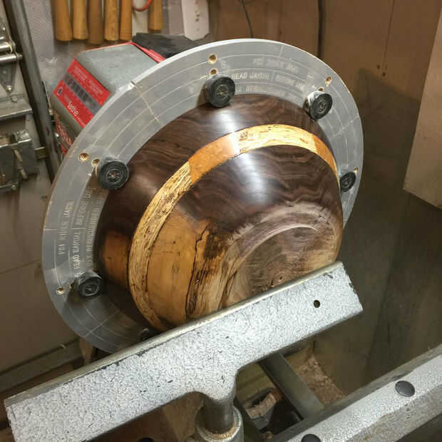 Me gusta usar un Cole mordazas para sostener el borde de mis cuencos así puedo terminar los fondos. Para este plato tenía suficiente material a la izquierda en la base para poder sacar el pie y producir un fondo liso. Después de lijado final y una capa de aceite mineral he añadido mi logo, año y #. El plato final se ve impresionante. El tablero de la prensa añade una textura muy singular mientras que el antiguo de pinotea añade un bonito mediados de color marrón.