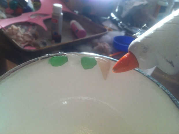 He utilizado pegamento caliente para adherir el vidrio del mar a los lados del tazón de fuente como un rompecabezas. Cuando empecé el siguiente paso algunas de las piezas alrededor del borde cayeron usé pegamento de guerrilla que para les vuelva a colocar. Limpie inmediatamente cualquier exceso de pegamento de cristal.