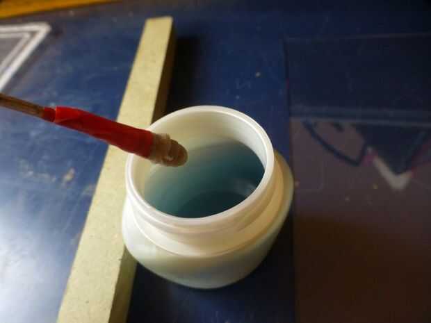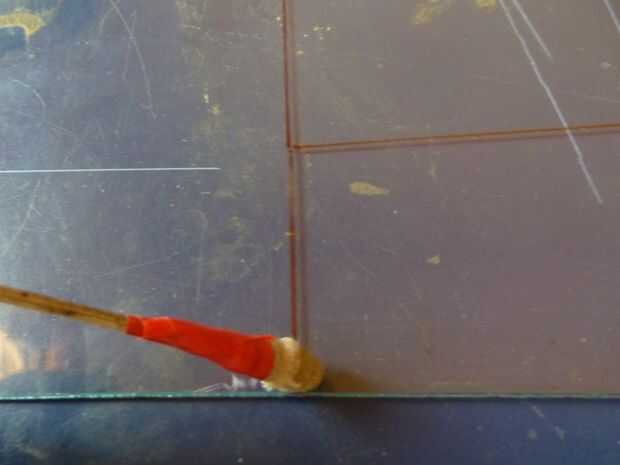 • Para cortar vidrio, o bien se puede aplicar el keroseno + camper cruda la mezcla encima de la línea de puntuación o mojar el filo del cortador de vidrio a la mezcla. Se trabajan igual. Aquí he utilizado un pequeño pedazo de algodón envuelto alrededor de un palo de fósforo para aplicar el lubricante sobre la línea.