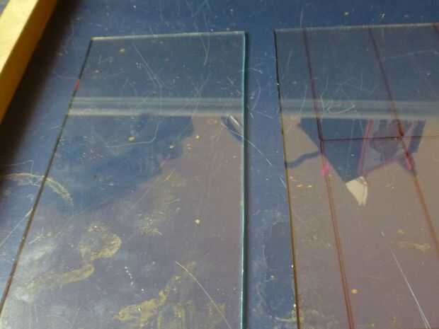 • Usando una regla, marcar sobre el vidrio a lo largo de las líneas marcadas. Fácilmente puede romper el cristal golpeándolo ligeramente a lo largo de la línea.