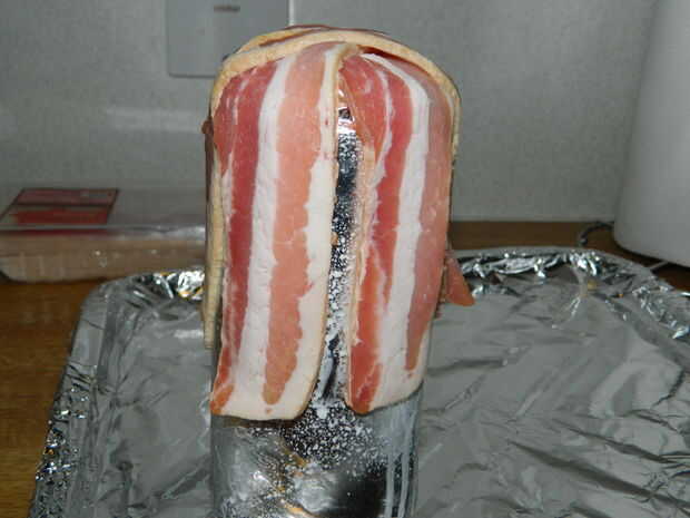 3 Cuelgue las tiras de bacon sobre la lata cubierta superior. También puede agregar algunos no spray autoadhesivo las latas para ayudar a quitar más tarde.