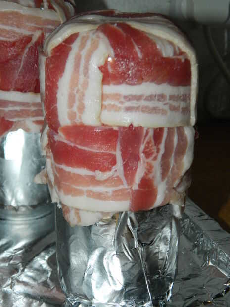 Dos o más tiras de tejido alrededor de la lata para formar la taza cruda. Más apretado el tejido mejor. El tocino se encogerá, y de un recipiente resistente, necesitarás una conexión fuerte.