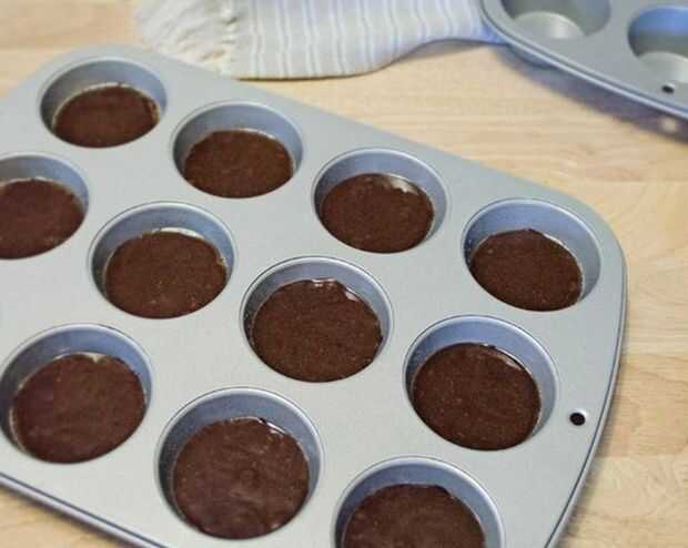 Rocíe la lata del mollete con galleta o frotar en mantequilla. Hacer el brownie mix según el paquete y llenar cada taza hasta llenarla 3/4.