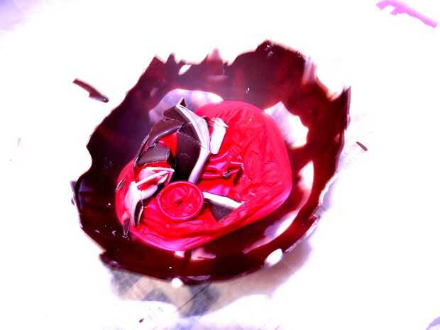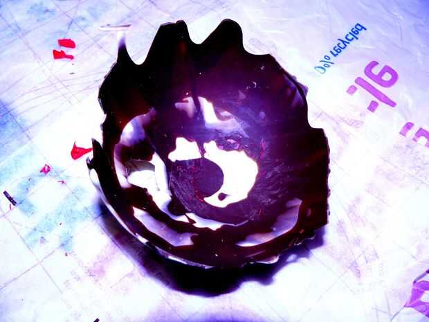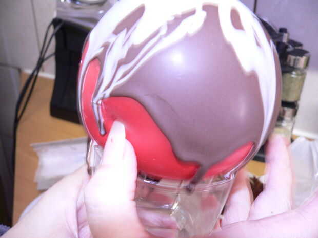 Ahora tienes que eliminar la forma de globo el chocolate. Lentamente y con cuidado utilizar tus uñas o con un cuchillo de mantequilla para aflojar el chocolate forma el balón (imágenes 1 y 2). Algunas de las tiras largas de chocolate pueden romperse durante el proceso pero su multa. Usted puede volver a aplicarlos después.