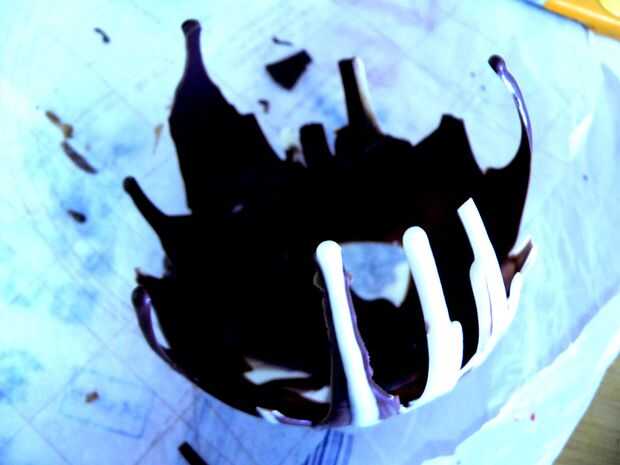 Una vez retirado el balón, puede volver a aplicar las piezas rotas con el chocolate derretido. Sumergir los trozos en el chocolate derretido y manténgalo en la posición deseada en el molde hasta que seque (imagen 1).