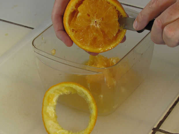 4. extraer el jugo restante de tus cuencos naranja. Puede usar un pelapapas para sacar la pulpa sobrante, esto no será necesario. Una vez limpias sus tazones de fuente de colocarlos en el refrigerador hasta que se necesite.