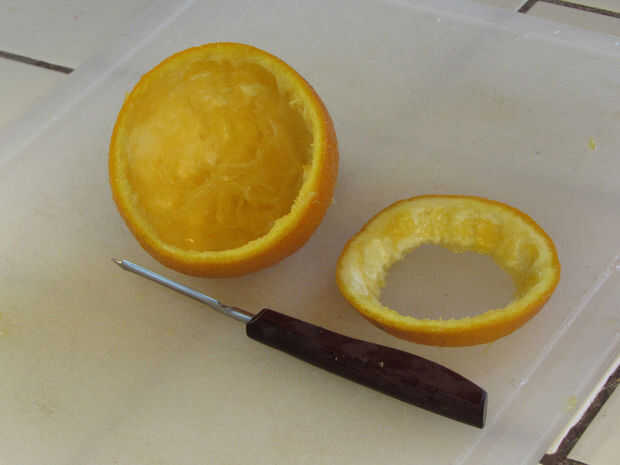1. cortar un trozo pequeño de la parte superior de la naranja, un poco más allá de la corteza, en la naranja real. No será necesaria esta pieza.