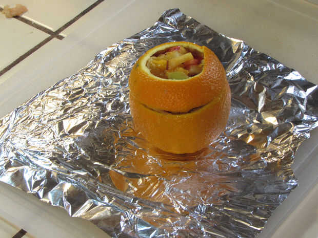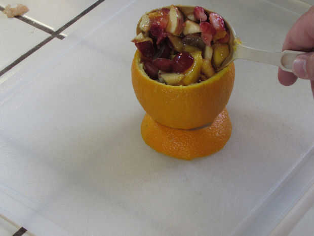 1. Llene su cuencos naranja con frutas. Puede Agregar un poco más en la parte superior que puede ser sostenido por el anillo.