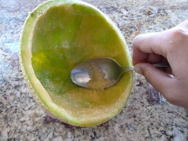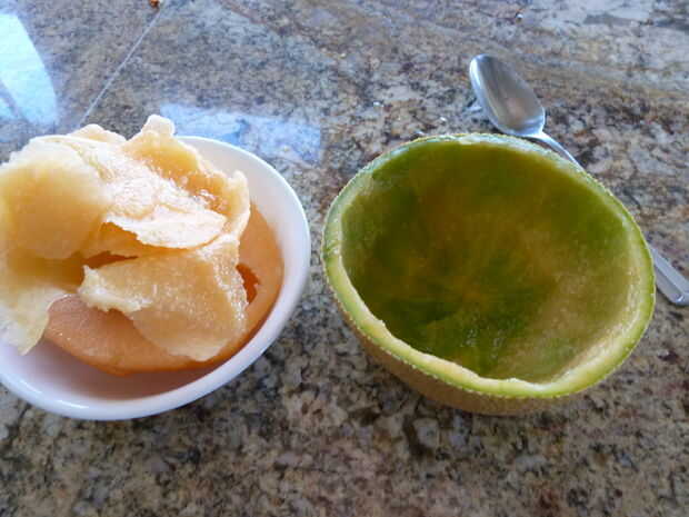 Con una cuchara grande, tallar hacia fuera el resto de la fruta dejando el borde exterior de la piel, lo suficientemente espesa para ser un recipiente para las bolas que hiciste anteriormente.