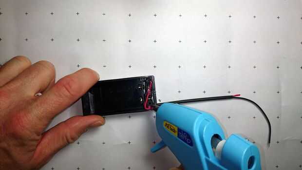 Aplique el pegamento dentro de recinto de 9V a los cables del orificio y el tubo del encogimiento.