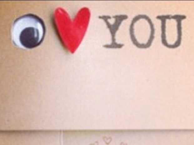 4) cortar un pequeño corazón rojo y pégalo en la parte exterior de la tarjeta cerca de los ojos/ojos